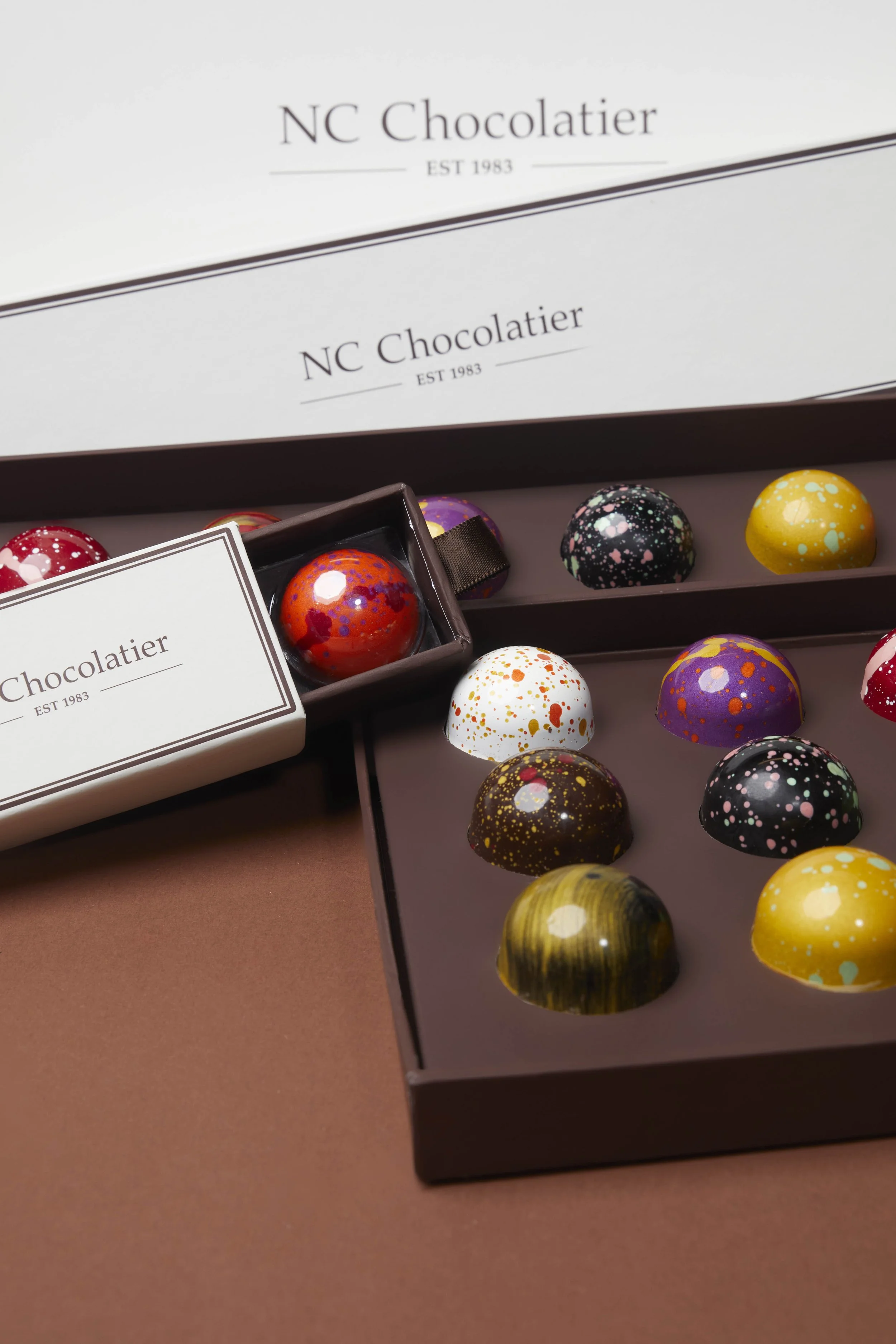 The final packaging solution is minimal and refined, allowing it to sit seamlessly within the larger NC Chocolatier packaging system.