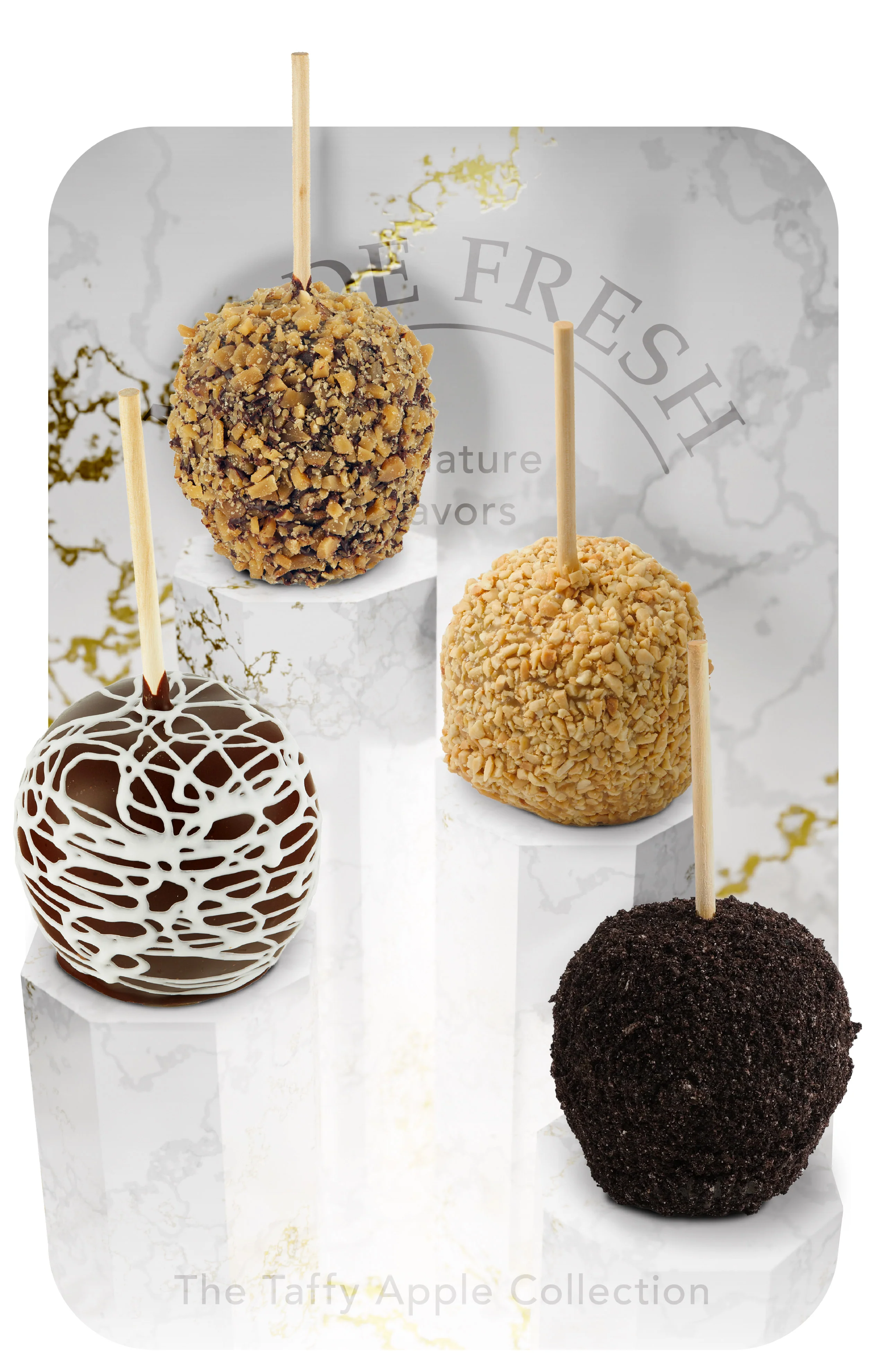 Uniquely rendered backgrounds create a visual identity for caramel apples, differentiating between seasonal, dark chocolate, milk chocolate, and gift box sets of four.