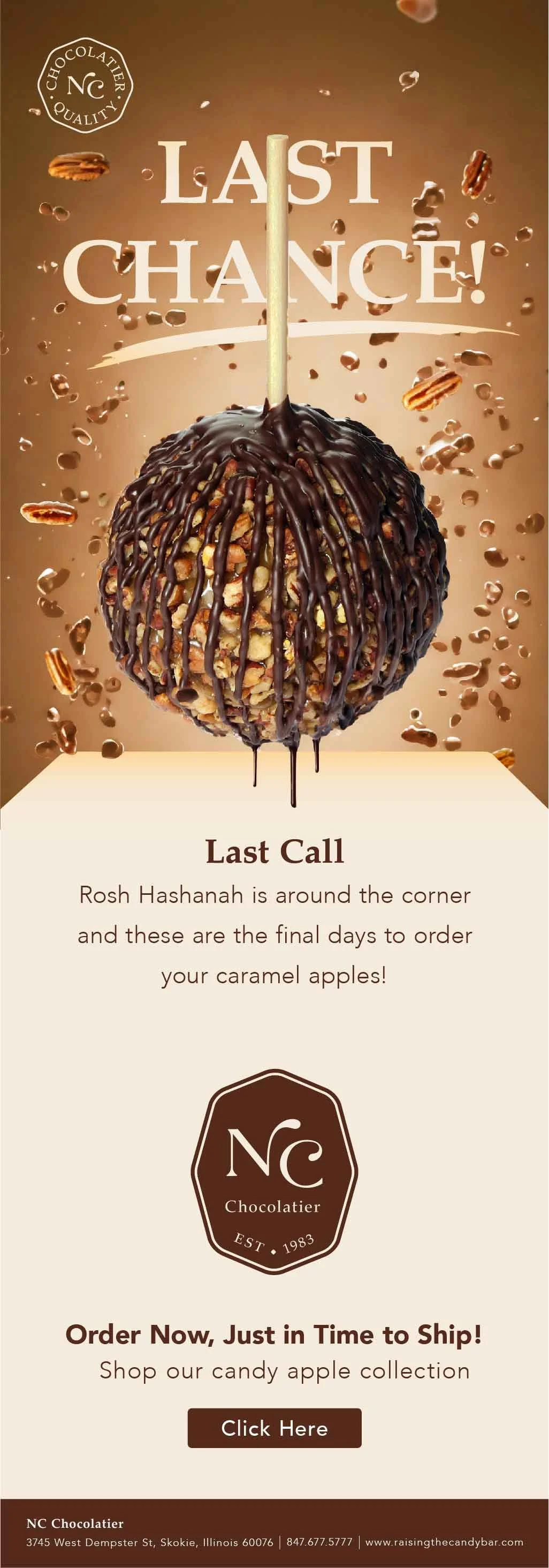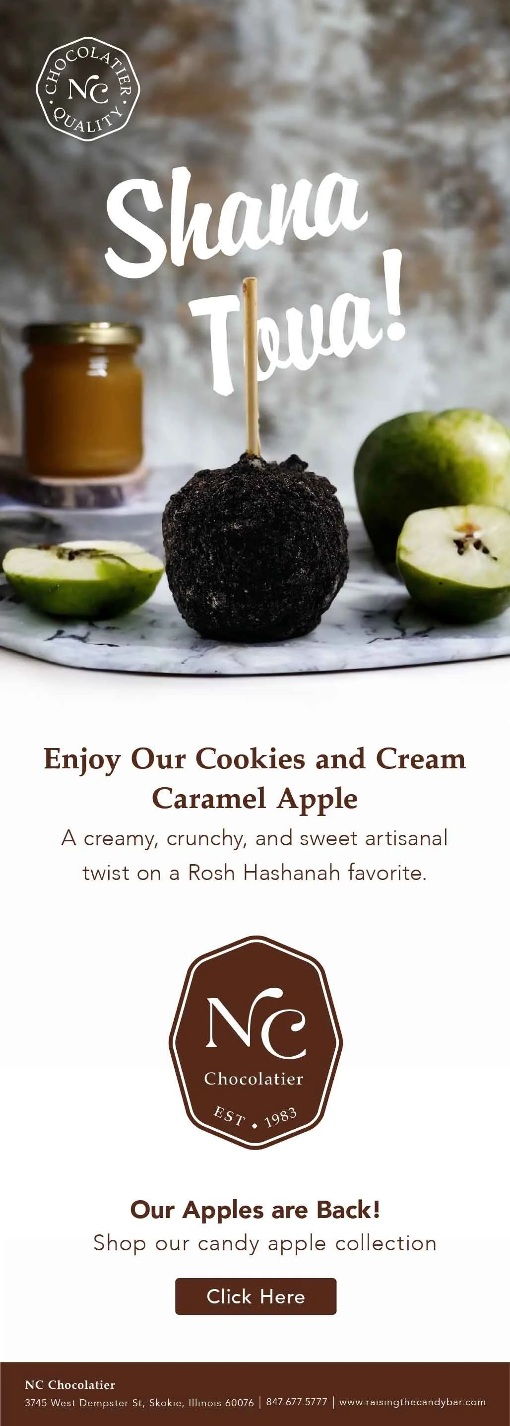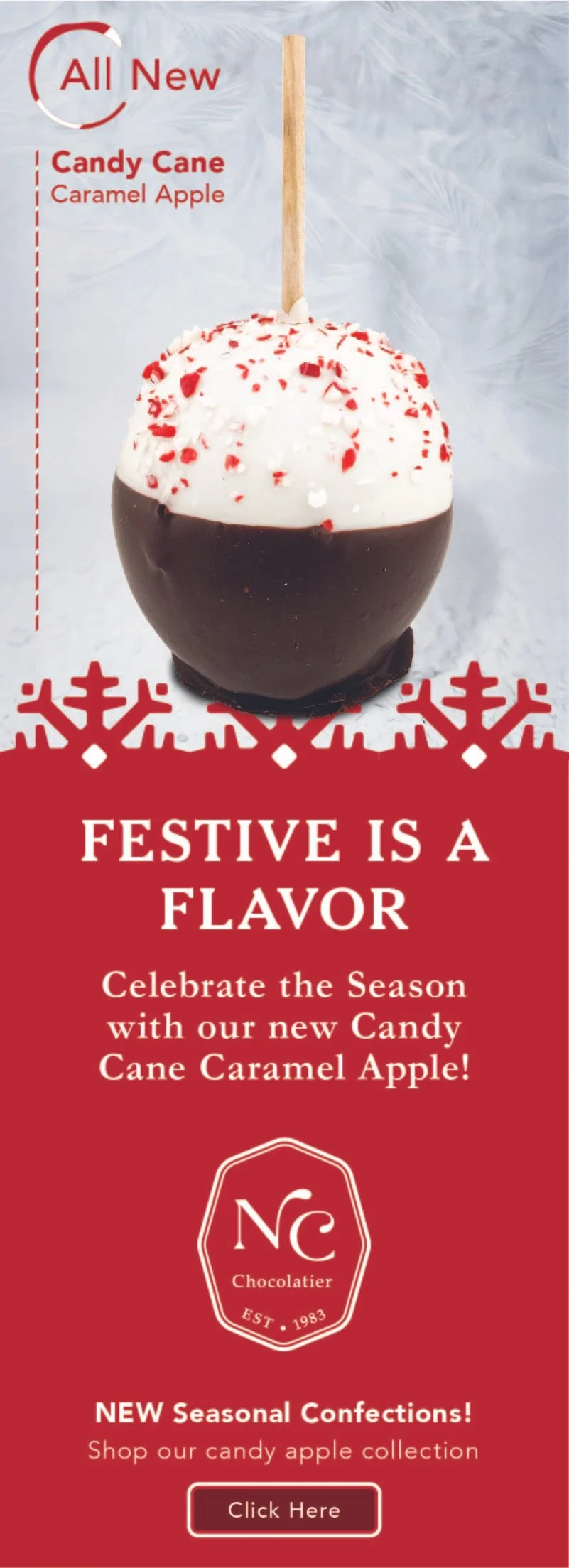 Caramel Apples are NC’s most popular confections, selling year round and rotating seasonal flavors. The caramel apples take on an identity of there own through listing images, packaging, and marketing material.