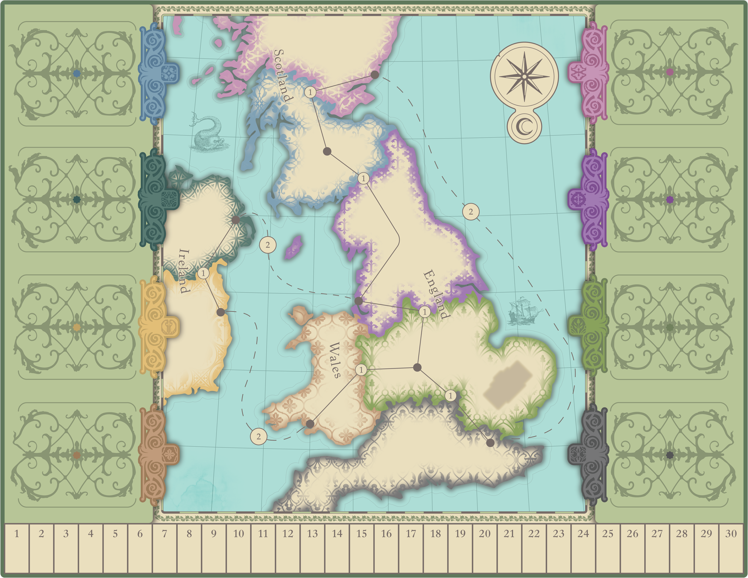 The main board was period inspired, drawing inspiration from mid 1800’s maps and cartography. Player tableaus were quickly wireframed along with developing mechanics, starting as rough outlines and growing into each character’s identity as the game was refined.