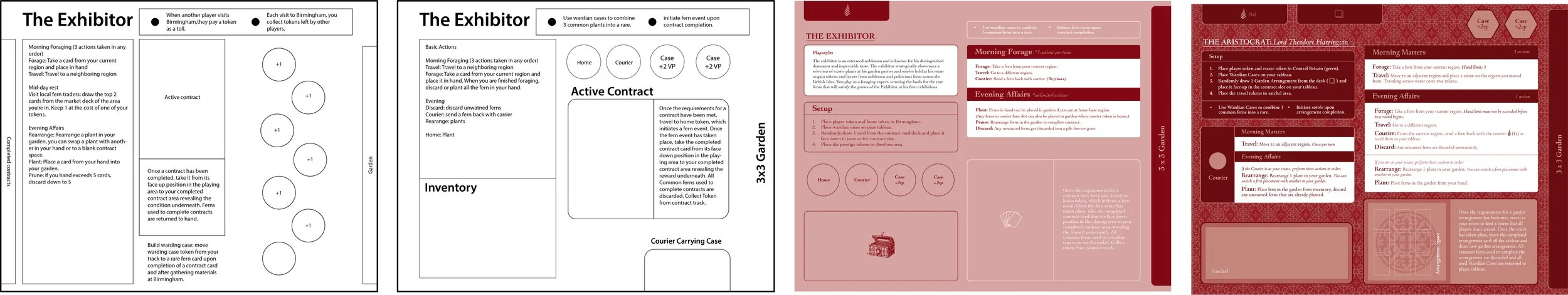 Players choose between four play styles within Pteridomania’s asymmetrical gameplay. Each of these play styles was inspired by researching and forming archetypes from the Victorian fern craze: prestige, wealth, research, and mythology. Each archetype has its own motives, playstyles, and pieces.