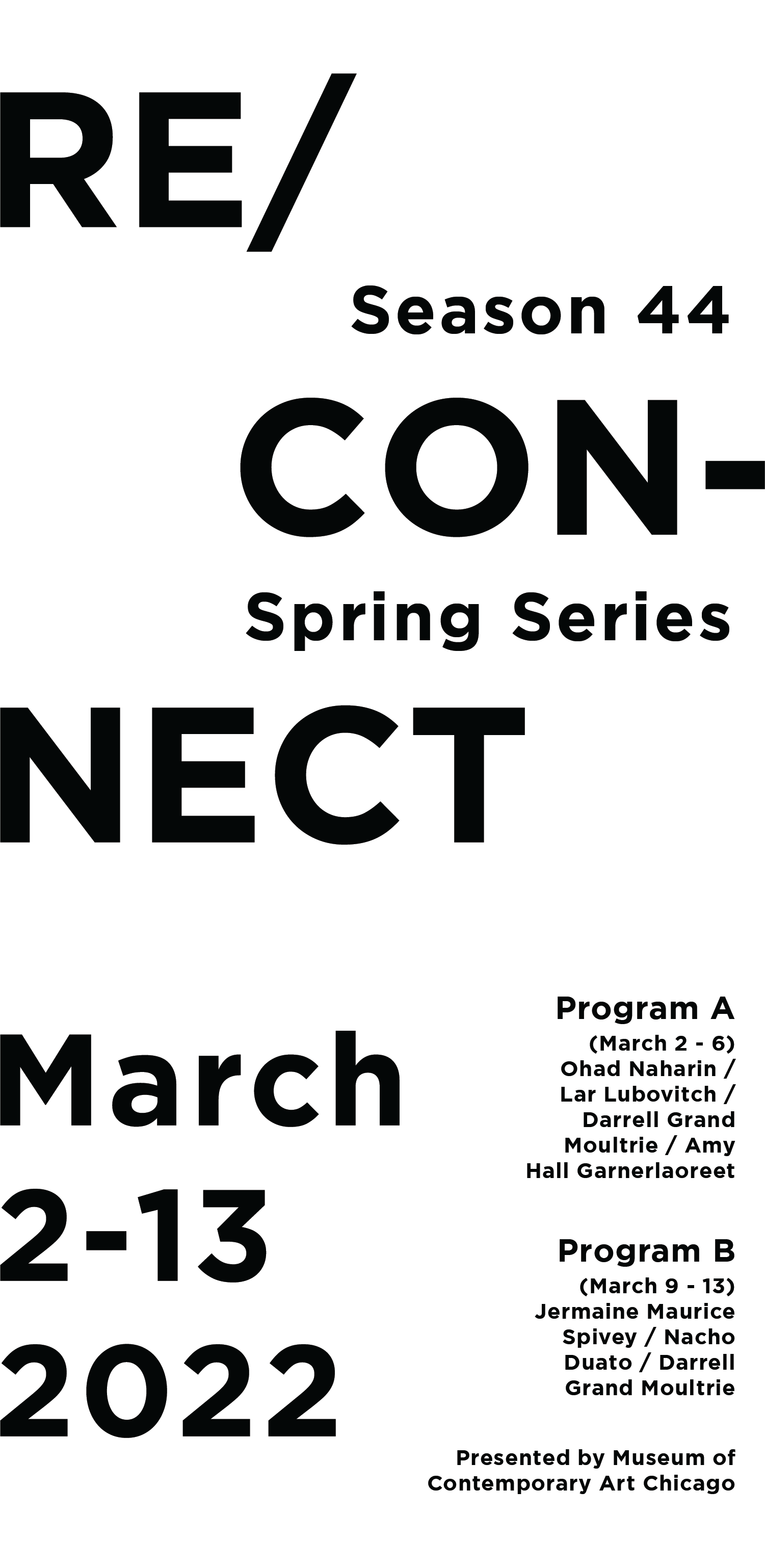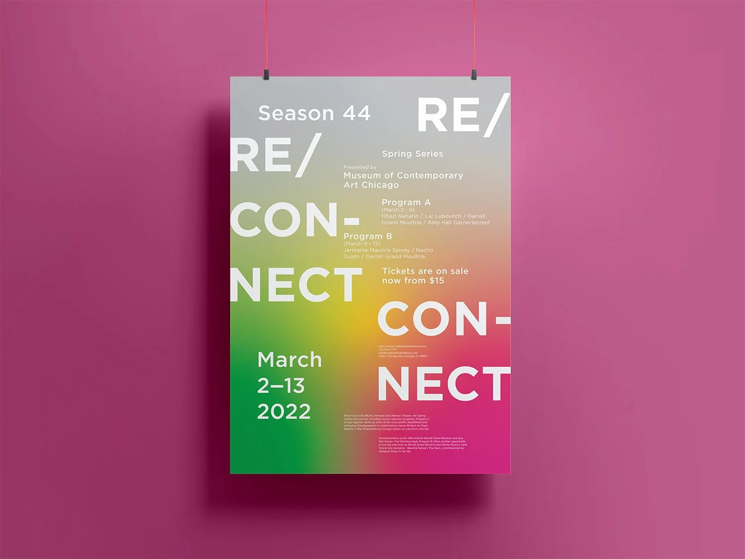 Conceptual print advertising for Chicago’s Re/Connect 2022 spring series. This identity explores a spring palette contrasting COVID-grey as well as soft and sharp shapes.